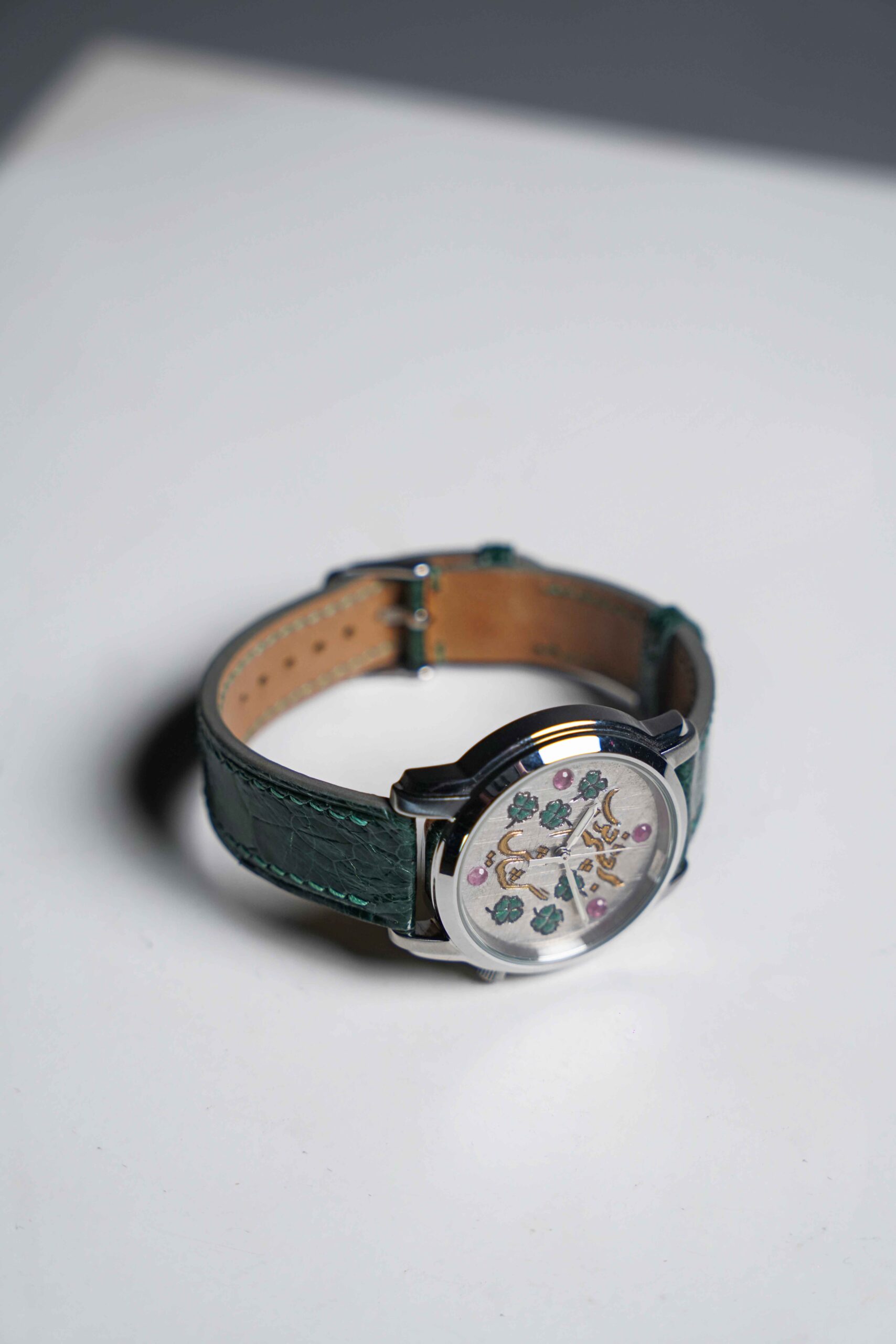 Enamel work, silver dial, Ruby stones, gilding, strap made of ostrich leg leather, automatic movement.